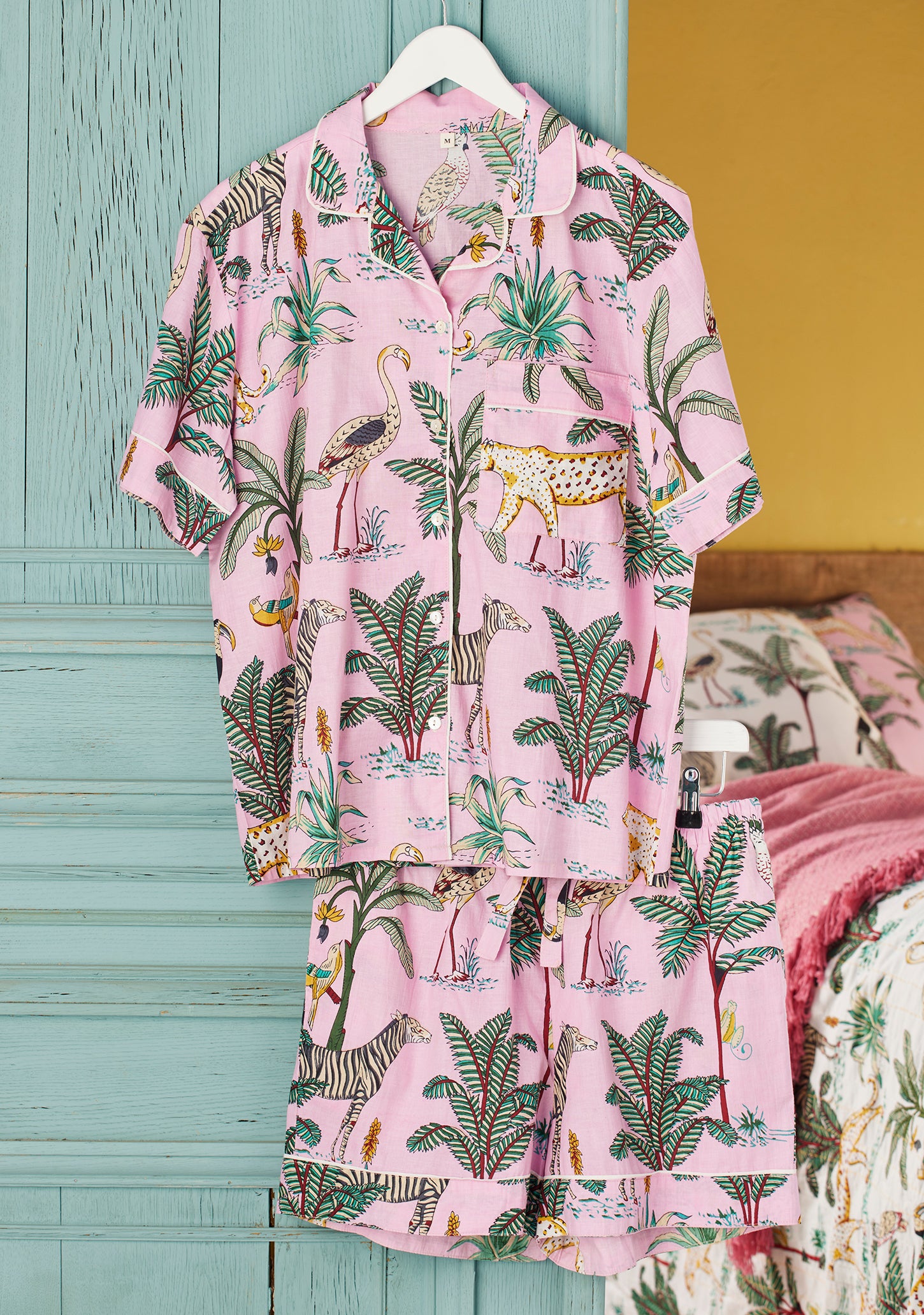 Sleep in a little slice of the wild with these pink jungle print short pyjamas, crafted from beautifully soft cotton and brought to life through hand screen printing. The design is a vibrant wonderland of lush plant life, exotic birds, and majestic big cats — playful, bold, and full of personality.